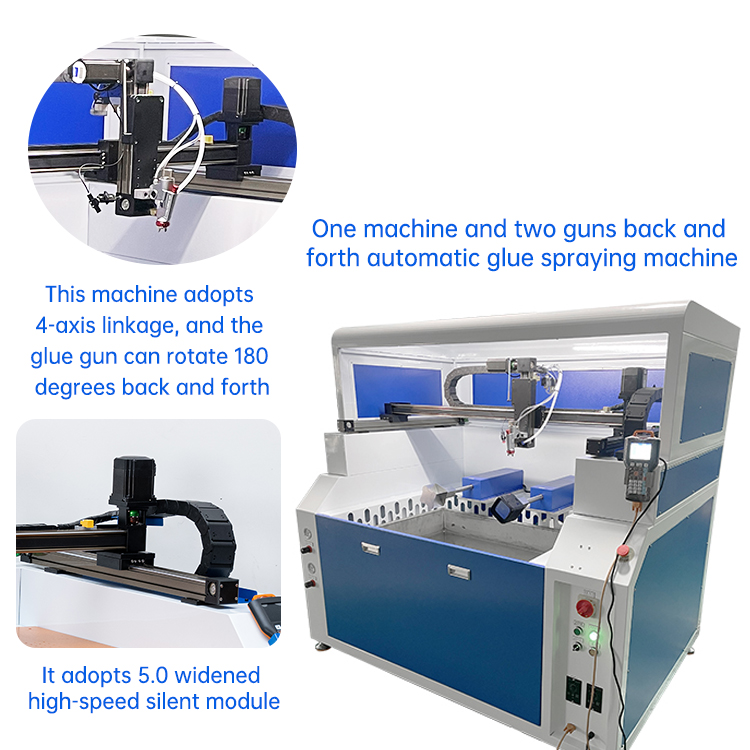 4. Utilizing a four-axis linkage, the rotating platform can hold two products for simultaneous glue spraying, and the glue gun can rotate 180 degrees forward and backward. The frame is raised to 40 cm on both sides, compared to 15 cm for conventional machines, enabling the spraying of three-dimensional products.