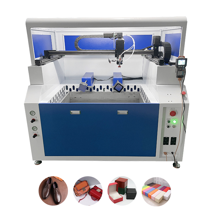 This fully automatic dual-gun glue sprayer is suitable for luggage and bag factories, gift and jewelry packaging factories, leather goods factories, electronic product leather case factories, jewelry factories, furniture factories, eyeglass case factories, automotive interior factories, shoe factories, and other industries.